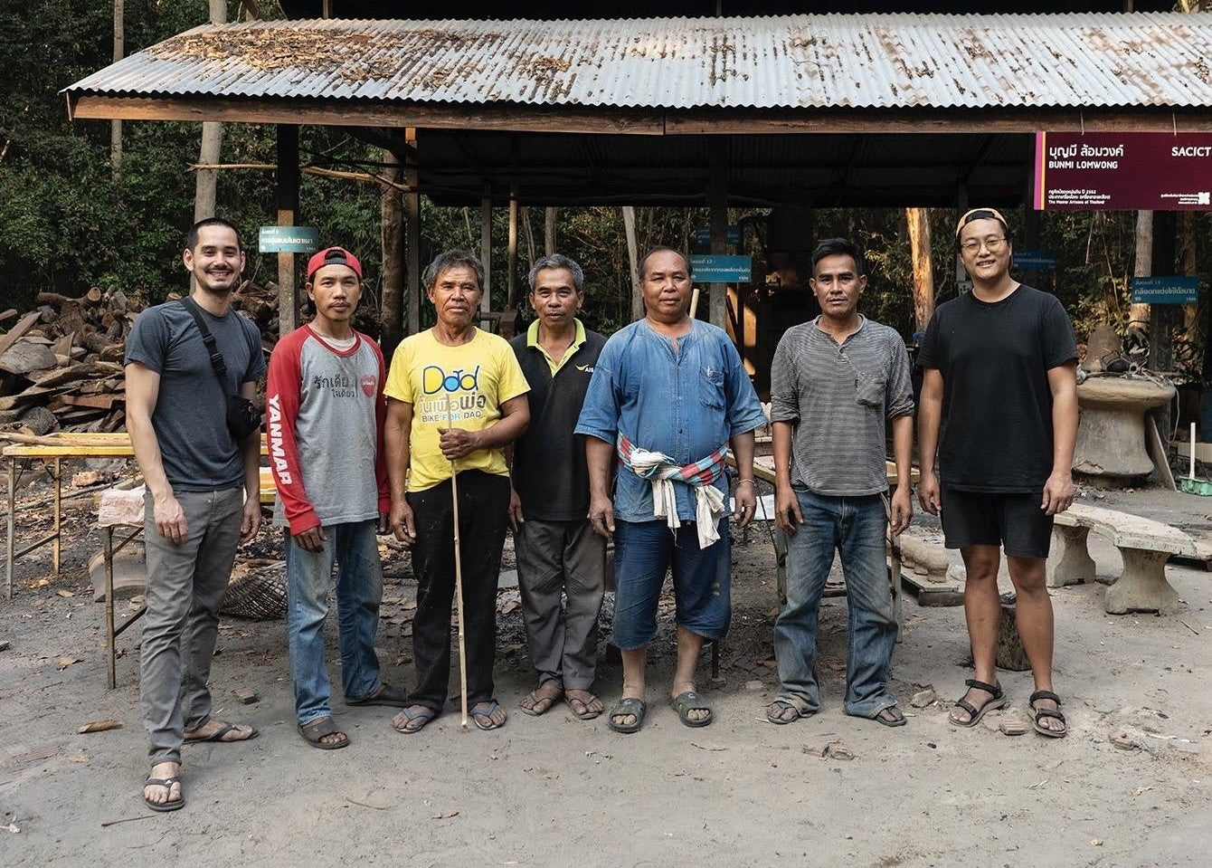 Pat Kim and I with Khun Boonmee Lomwong and his team of artisans during our first trip to Ban Pa Ao brass casting village in 2020