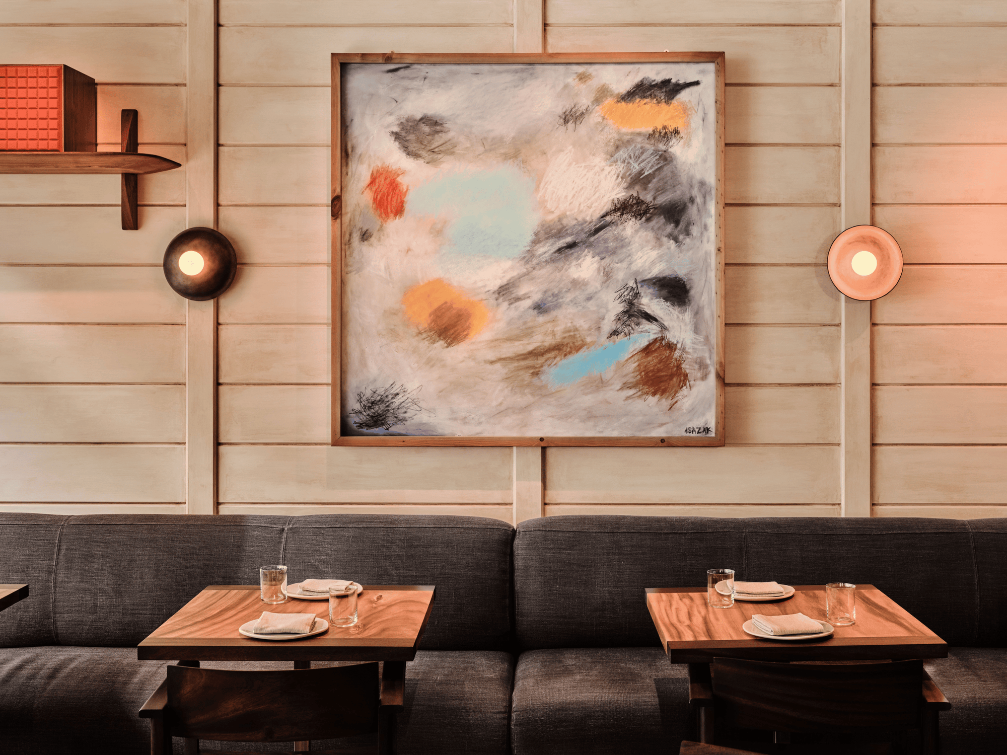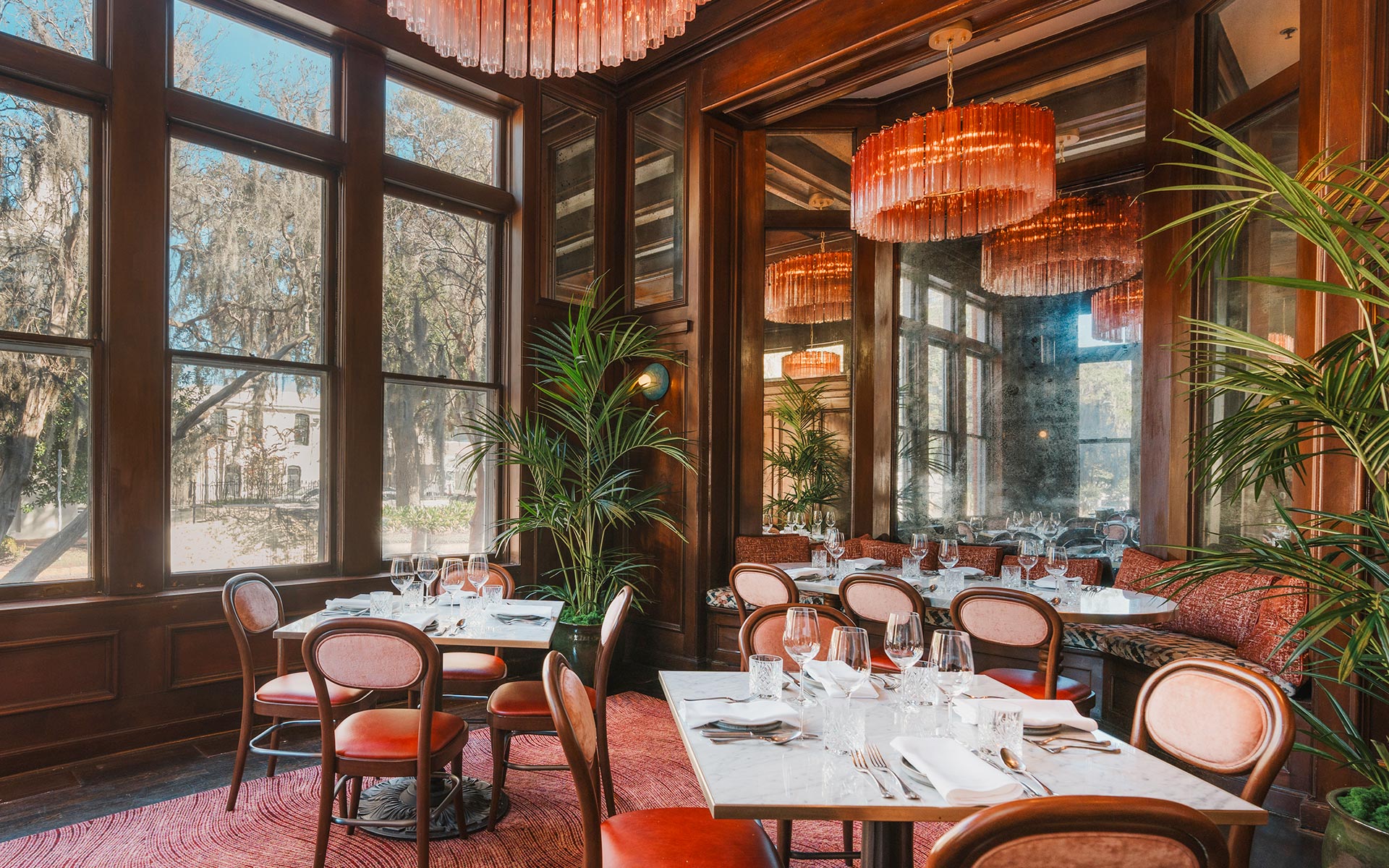 Rice Husk Blue Ban Pa Ao Sconce’s adorn the wood paneled walls of Saint Bibiana restaurant at Hotel Bardo, Savannah. Photo © Andrew Frazier