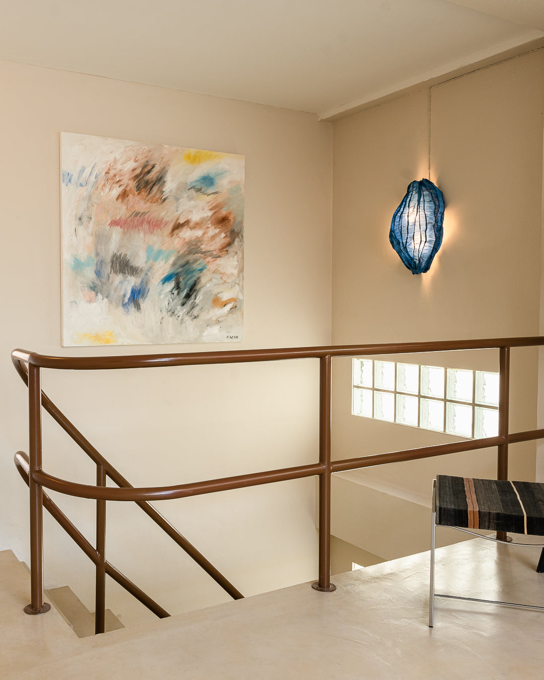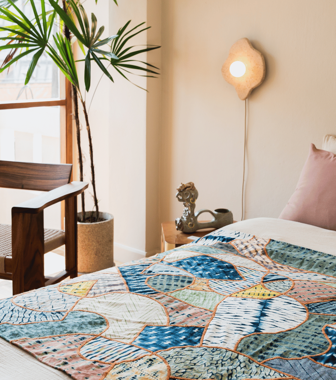 As for the colors, there was already a beautiful collection of objects and installations at PERN BAAN such as the lamps and sconces with their blends of blue and warm copper-brown tones. We took that combination as the starting point as it resonates with our own aesthetic of exploring the interplay of blue and earth tones in Slowstitch textiles.