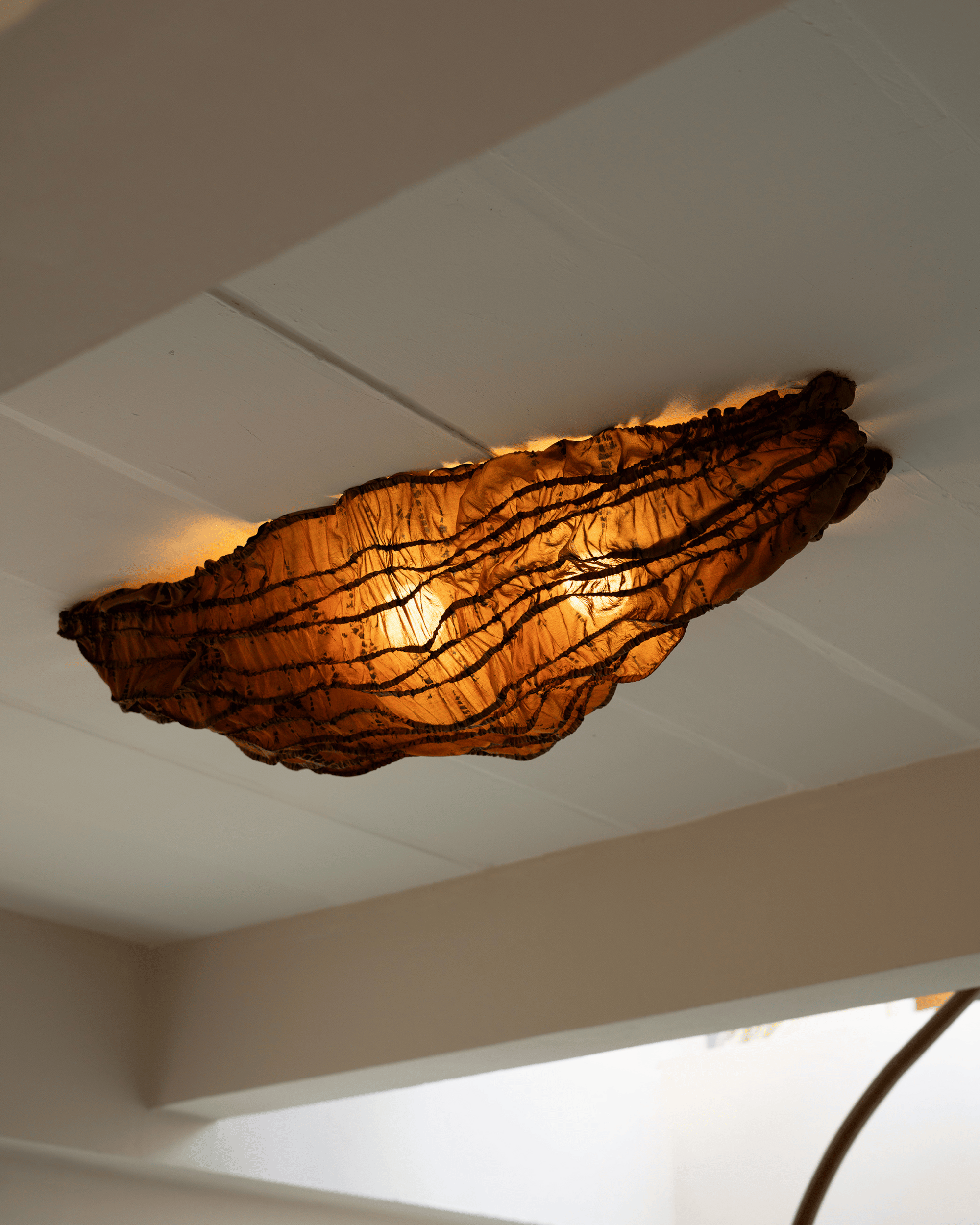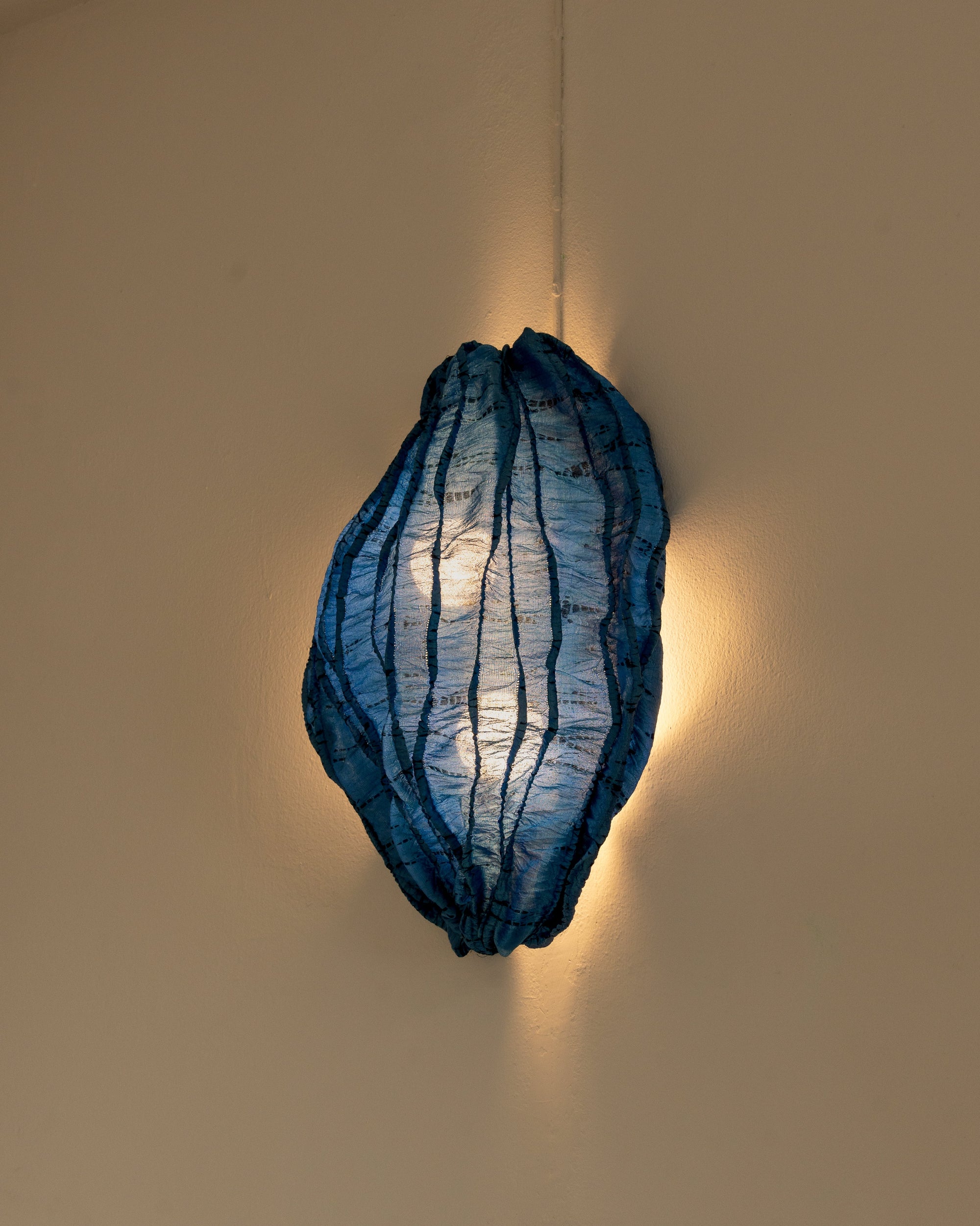 For the lighting designs, we aimed to translate the essence of shibori by drawing inspiration from our stitching techniques. Instead of ironing the dyed fabric flat, as is typical for textile products, we aimed to capture its temporarythree-dimensional quality- a quality which is usually just a midway step in the dyeing process. Thai silk, with its lustrous sheen and structural pliability, was the material of choice.