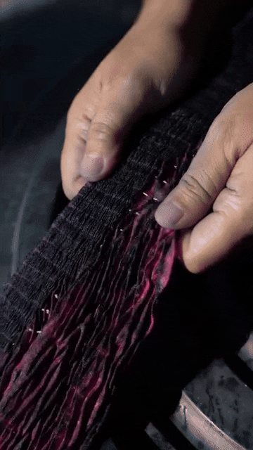 The studio’s work is rooted in the ancient Japanese art of Shibori, specifically stitch-resist dyeing—a time-honored method that turns fabric into a canvas of organic, flowing patterns. With every stitch placed by hand, the fabric is bound, dyed, and then released, revealing breathtaking color gradations and blurred-edge motifs that seem to hold movement within them.