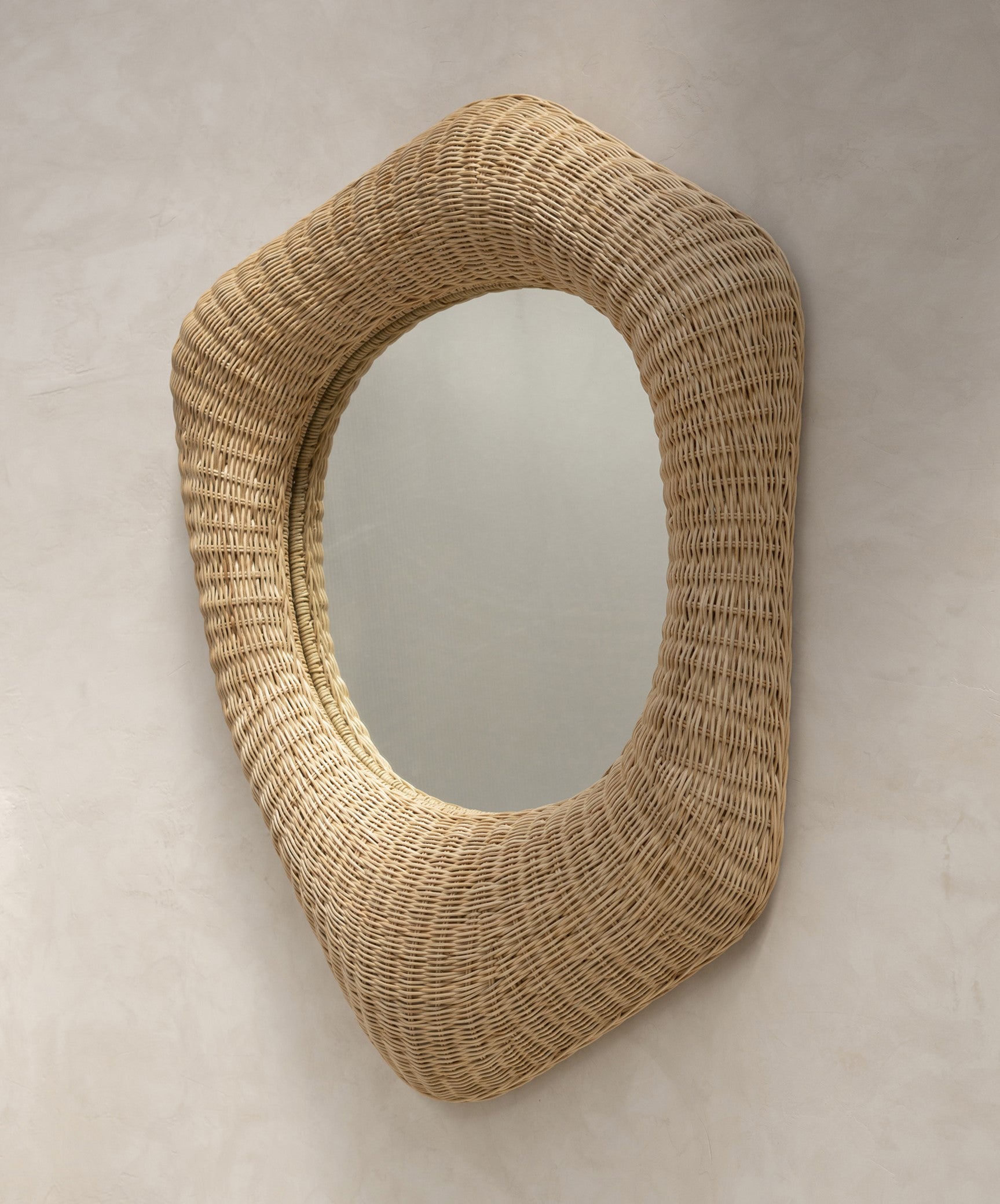 Once woven, the mirrors undergo a meticulous treatment process within the Corner 43 workshop, where artisans burn away any excess rattan fuzz and hand-sand the surface to achieve a smooth finish.