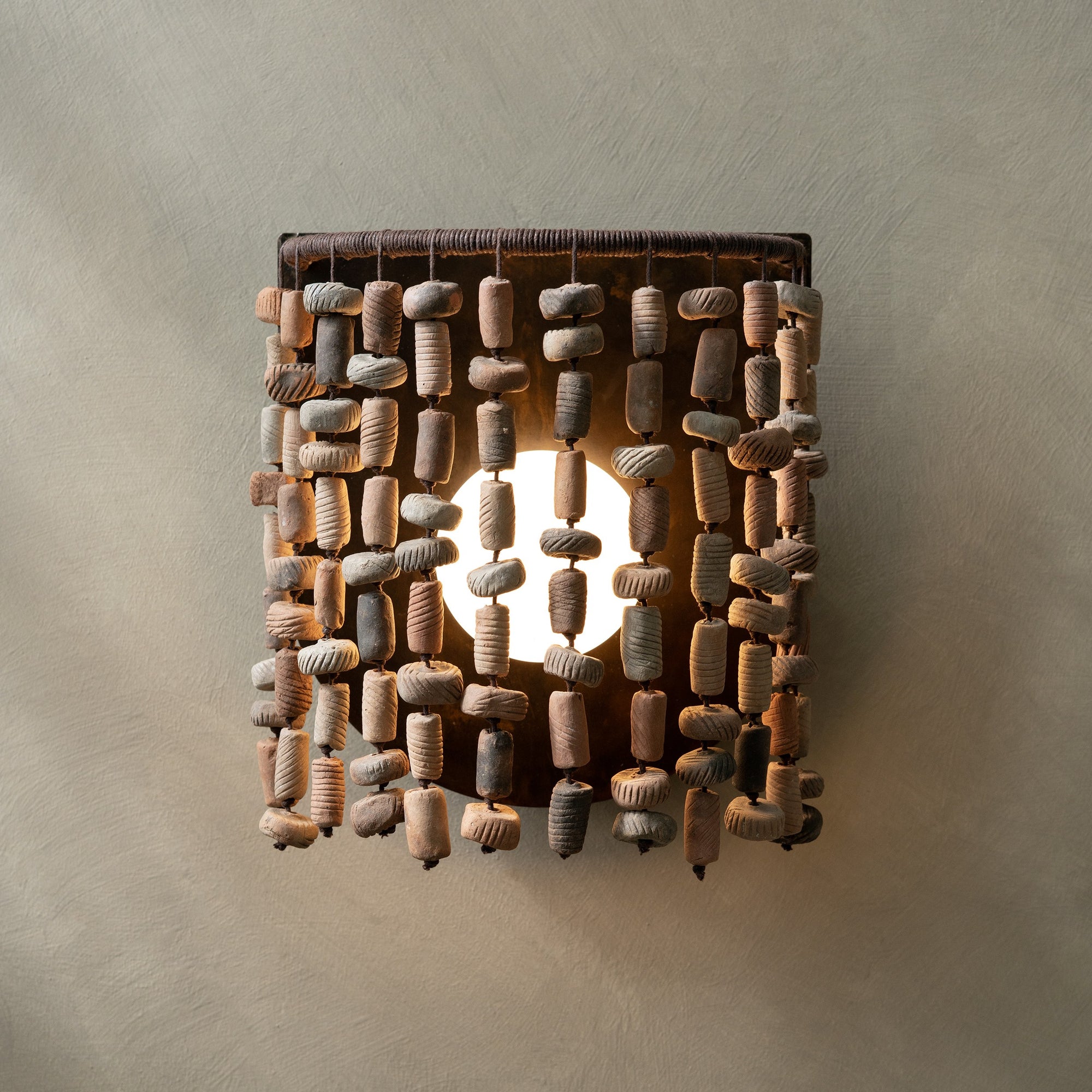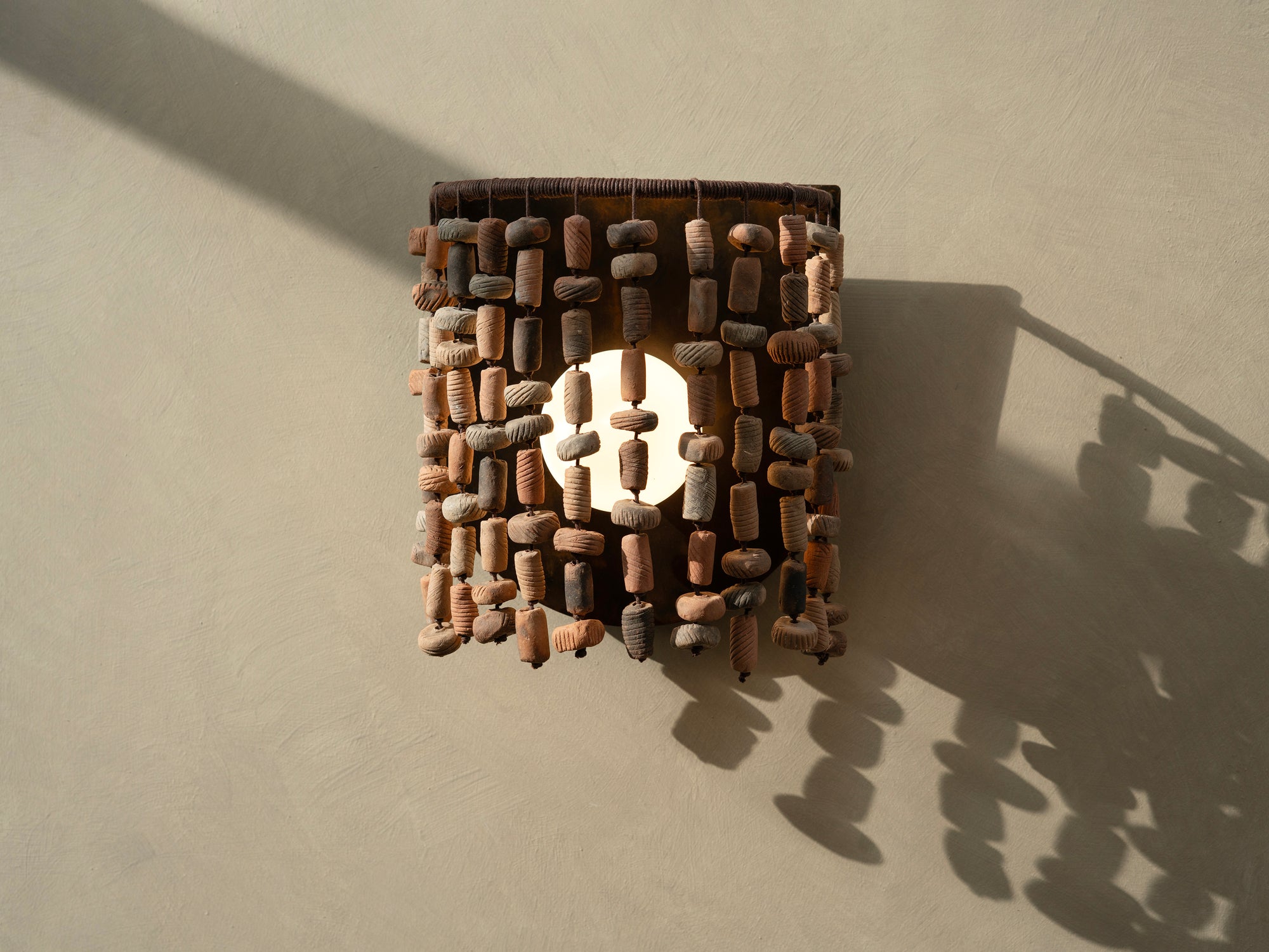 Each terracotta bead is hand-shaped by Chiang Mai artist Supthongkhum SR Studio, whose expressive ceramic work gives the piece its tactile, irregular rhythm. Strung together with waxed cord over a heavy antiqued steel frame, the beads create a veil of earthy texture that softens the light and adds a warm, inviting glow to any space.