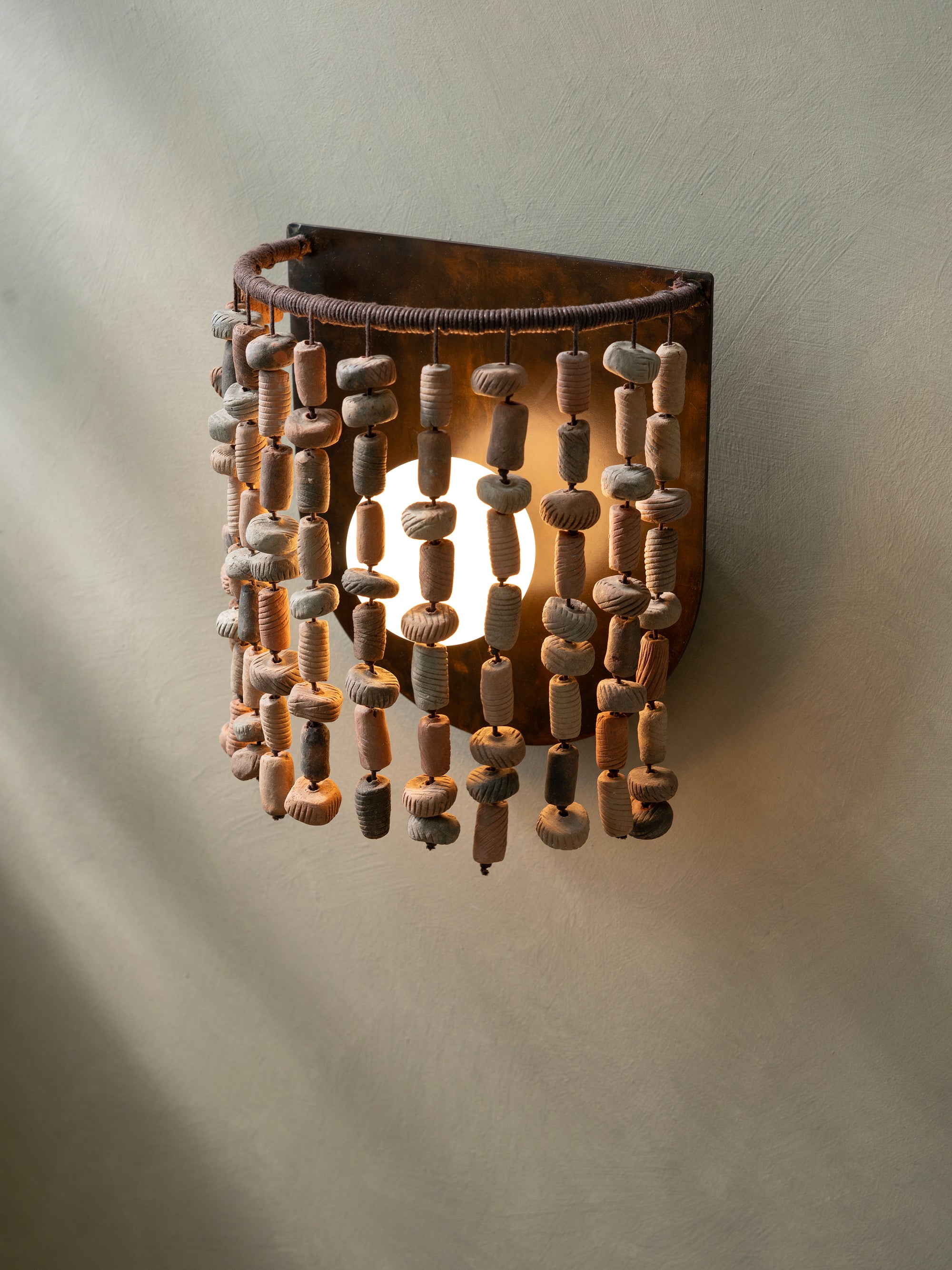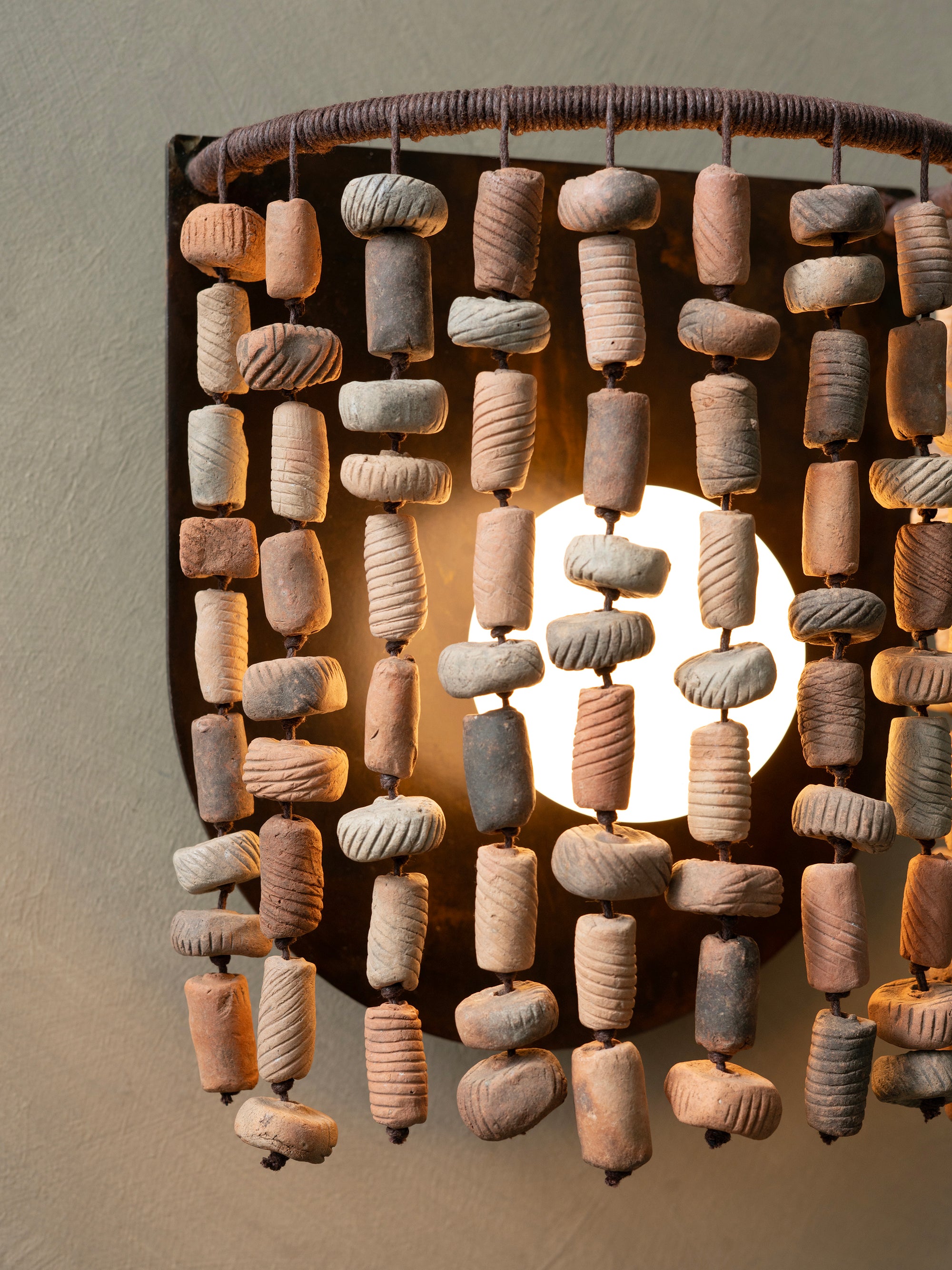 Materials: Hand-sculpted terracotta beads, waxed string, antiqued steel, frosted glass diffuser