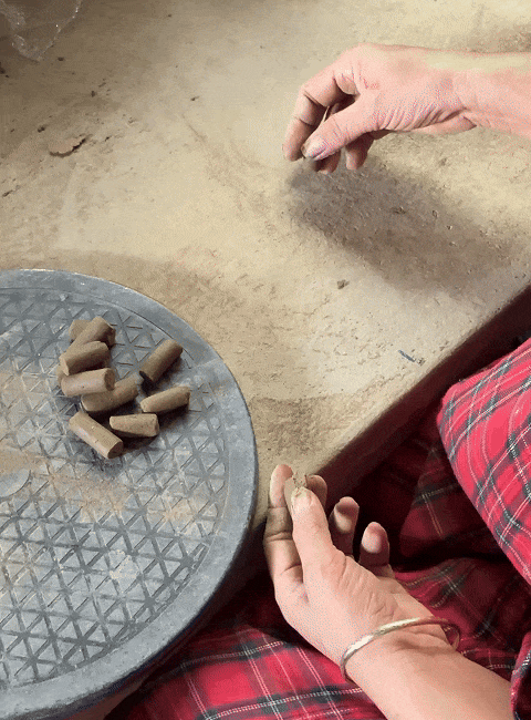 Years later, after returning to Thailand and building his own studio, P Dang began making these sculpted beads—hand-rolled, imprinted, and fired using traditional clay techniques. On one of Robert’s visits, he spotted them hanging in long strands near the entrance, catching the light and swaying gently like wind chimes or ceremonial garlands.