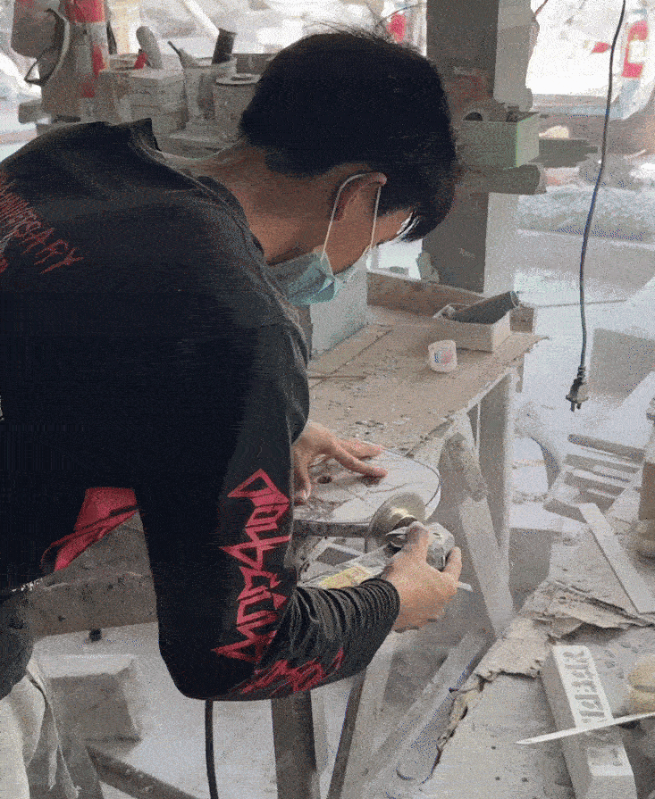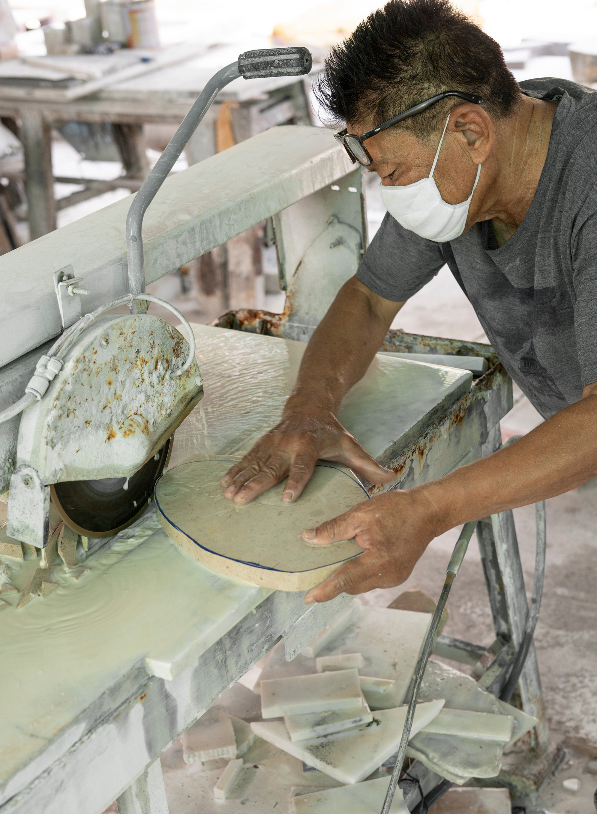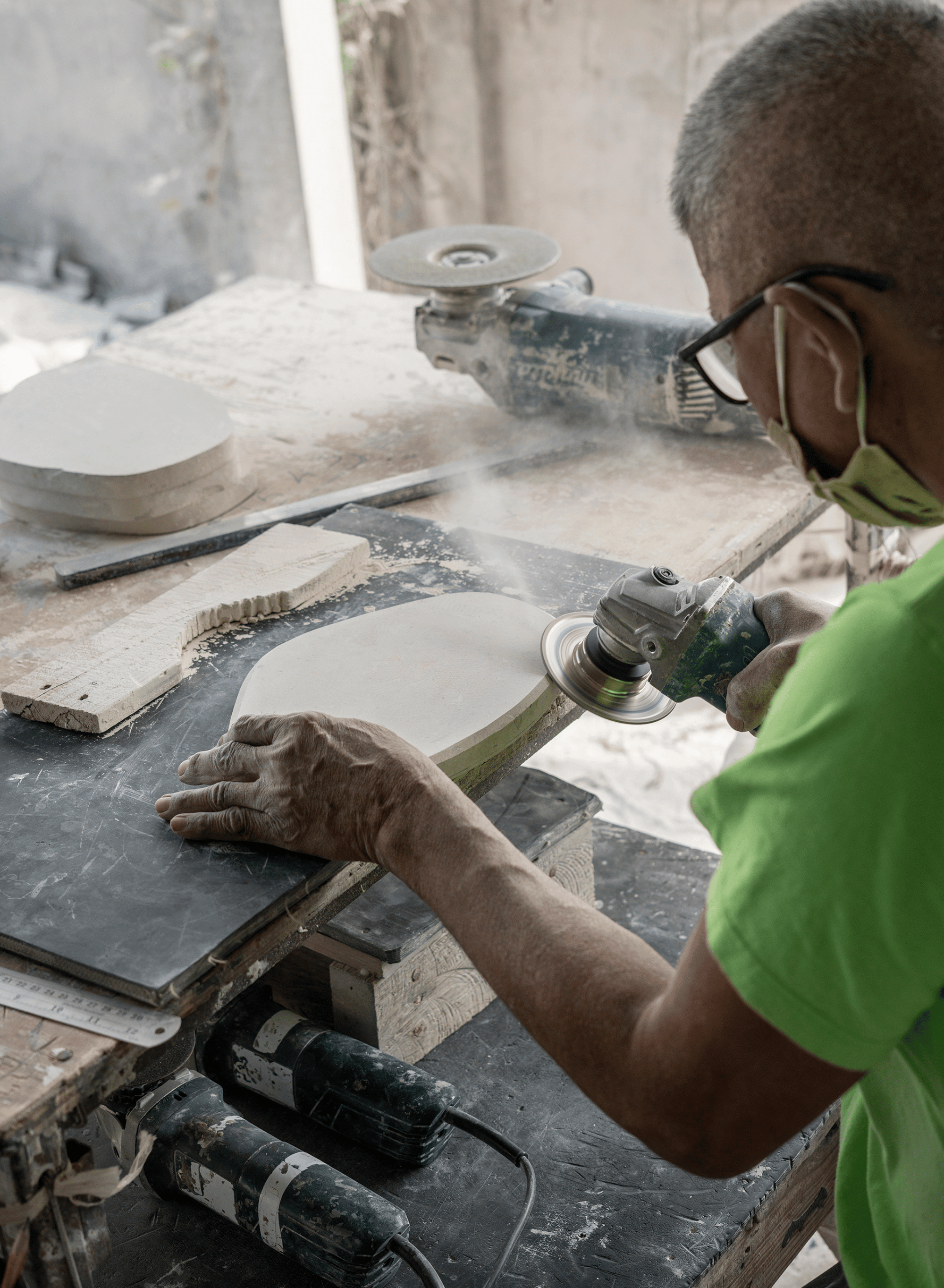 Our founder Robert Sukrachand chooses the boulders for their unique color and veining, and then these massive hunks of stone are sliced into thin sheets on a wet saw. After carefully tracing the Blob shape, the forms are cut rough and later refined by hand with a series of grinders.