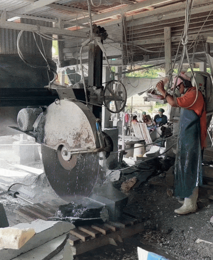 The entrance to P Wee’s marble workshop is strewn with irregular marble boulders that were too unruly for large quarries to make it into countertops.