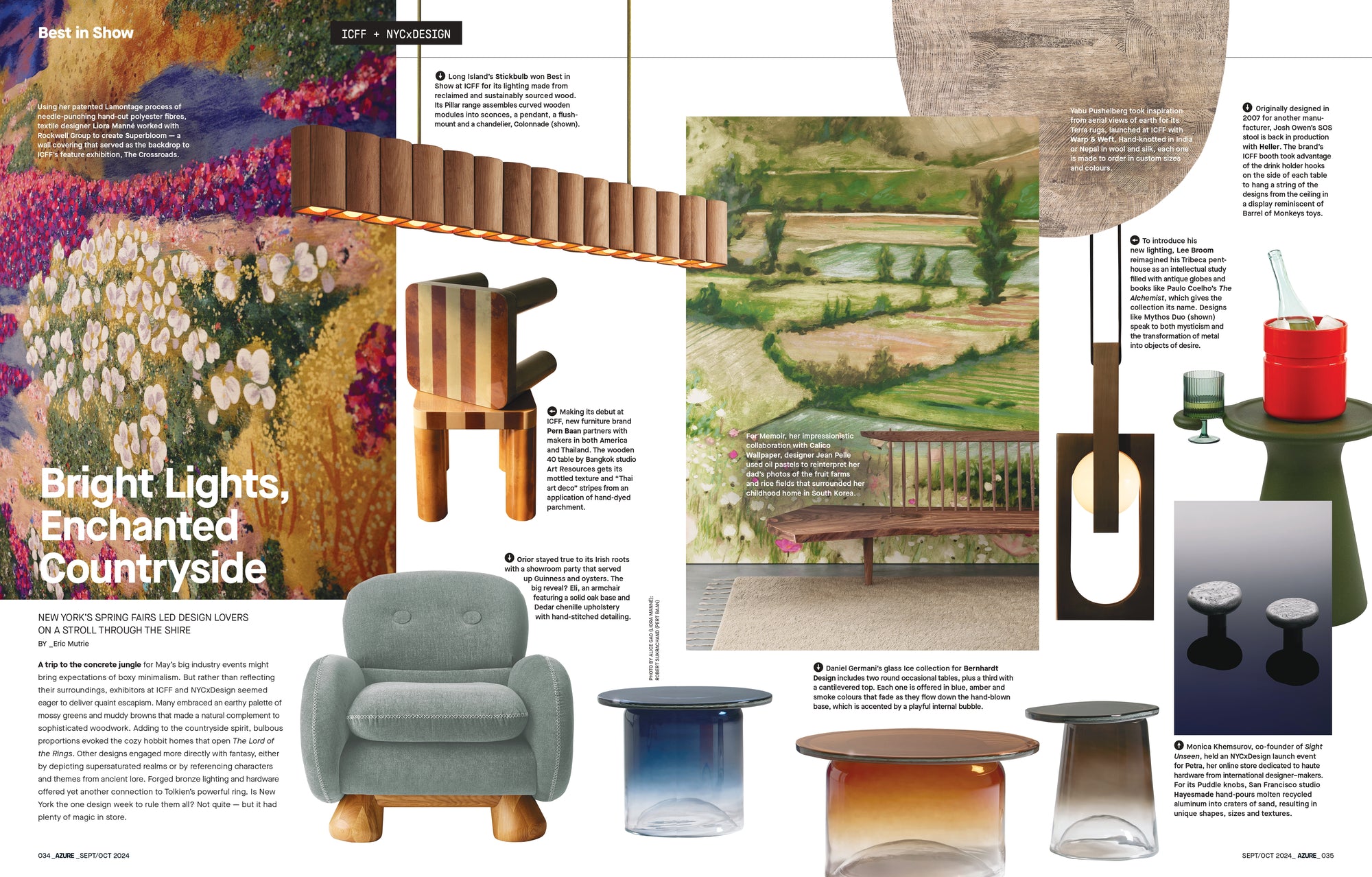 Making its debut at ICFF, new furniture brand Pern Baan partners with makers in both America and Thailand. The wooden 40 table by Bangkok studio Art Resources gets its mottled texture and "Thai art deco" stripes from an application of hand-dyed parchment.
