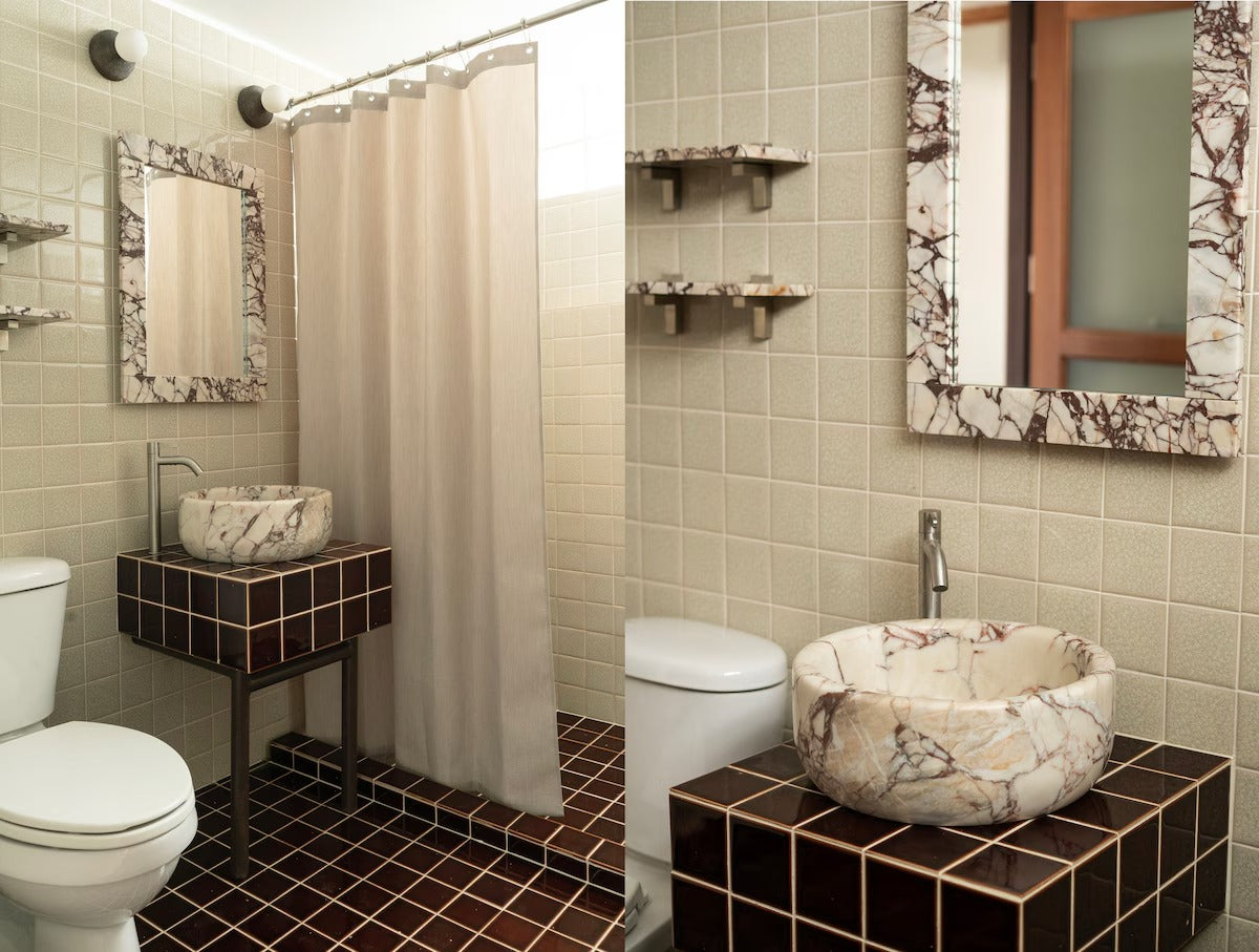 The bathroom is anchored by a sink carved from our signature chocolate marble, illuminated by a pair of Ban Pa Ao mini sconces. Handmade tiles line the walls, their subtle texture harmonizing with the warm glow of the lighting — a space where simple moments are framed by thoughtful detail.