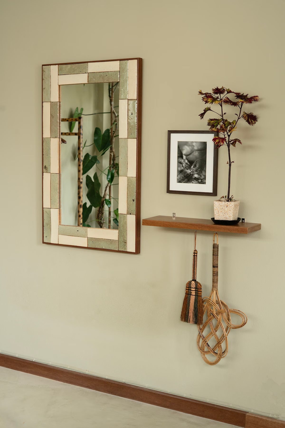 On the third floor, the bedroom is brightened by a handcrafted tile mirror, our signature Beaded Sconce, and a Ban Pa Ao Double Bubble Lamp. A bamboo closet adds natural warmth, while a lush green plant anchors the space with a touch of life and ease.